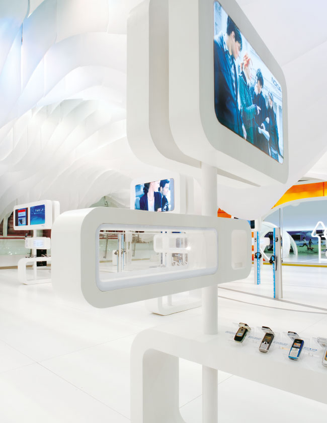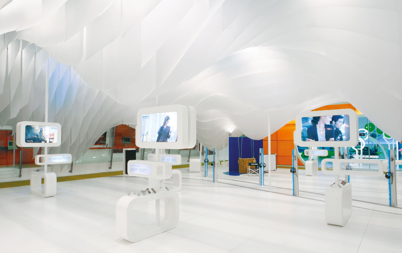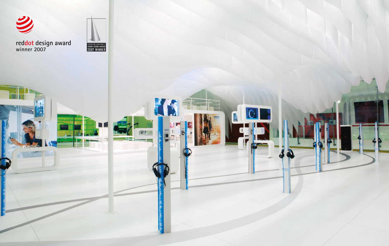 The goal for this stand was to present the leading qualities of Nokia: creative, innovative, humane; by emphasizing their proficiency in design and entertainment technologies emphasized mostly in music. The main challenge was to build a dream-like structure unifying the stand as a whole while offering the visitors the warm, surprising feeling of technology and music.