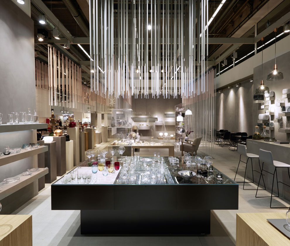 The essence of space was given with raw material usage. Just like glass shaping its content and making it visible, the space serves functionally for the same matter between the observer and the products.