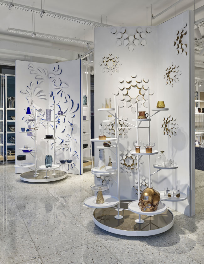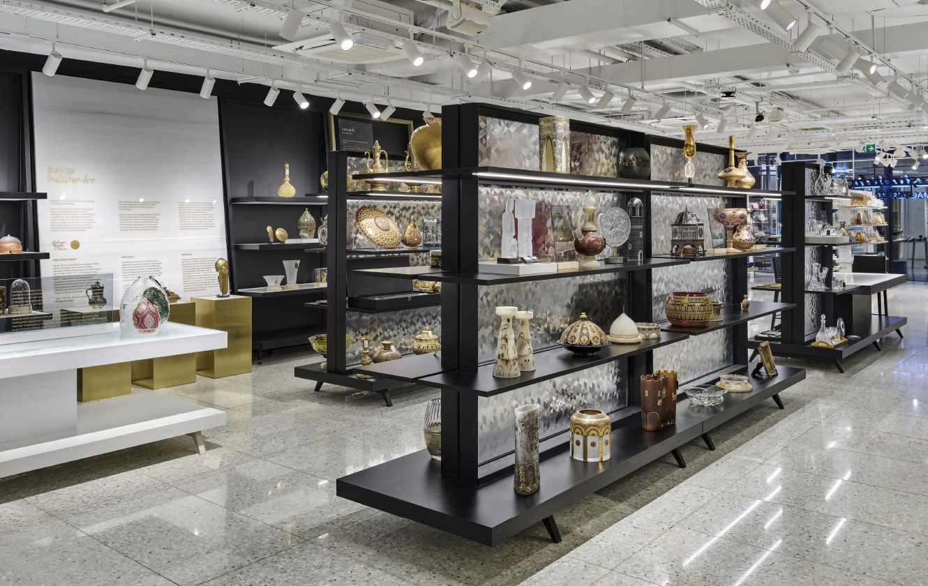 For the Boutique section, the magical world of glass is presented in a contemporary museum display setup that includes all collections in which glass work is skillfully reflected. Effective communication areas that mirror the stories of the collections were integrated into the display units. The reflection of culture on glass turns into an elegant world of exploration; sometimes specializing in a niche, sometimes offering a museum experience in front of a marble wall.