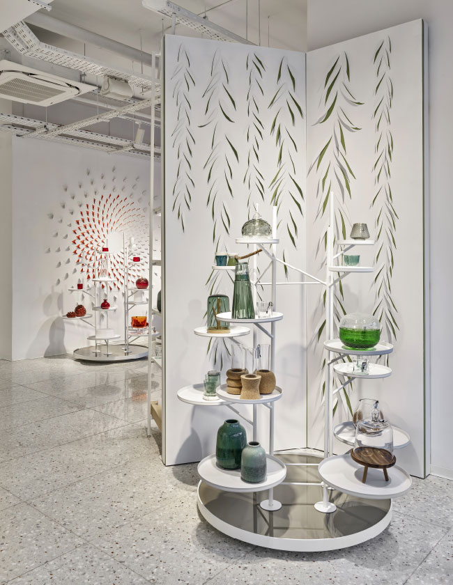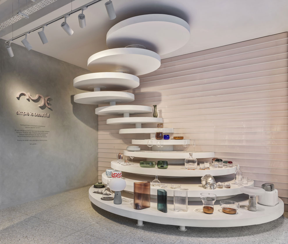 The holistic harmony of design is handled with a sincere, humane and respectful scenario. The store aims to sustain environmental awareness and commitment to nature with the use of natural materials such as iron, wood, wicker, glass, terrazzo. The installation, which is a contemporary nature representation of the glass production techniques of the brand, extends from the bottom floor to the top floor of the 1200 square meter store consisting of three floors. The installation also serves as an instrument of the in-store navigation system by inviting its customers to the other floors. The floor space opened for this installation on the 1st floor turns into an architectural element and the 12-meter-high magnificent composition of various glass forms brings the inspiration of nature to the store through its transparency and texture.