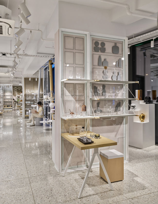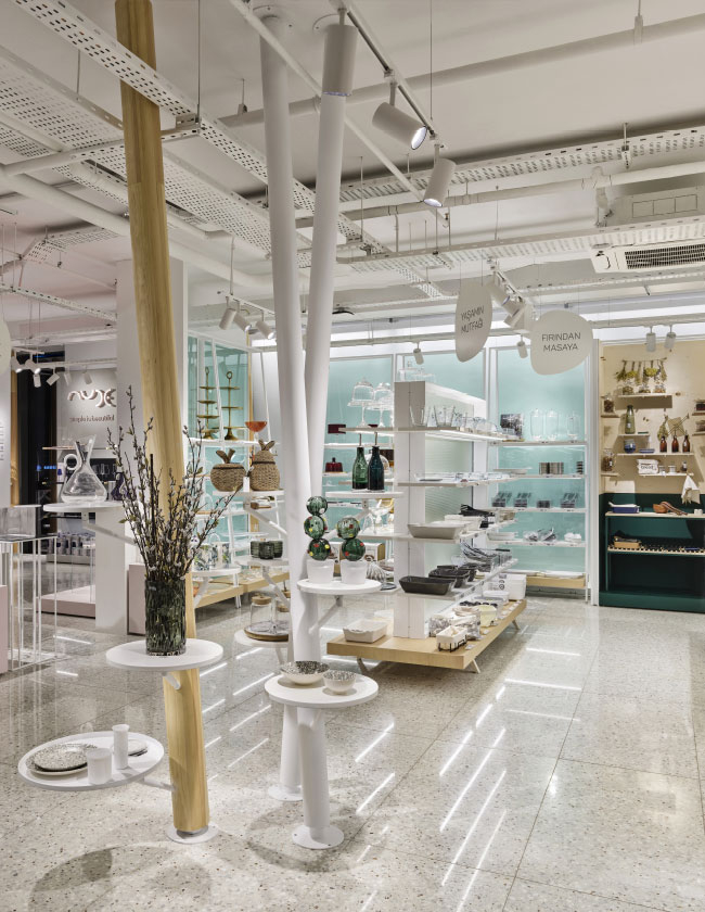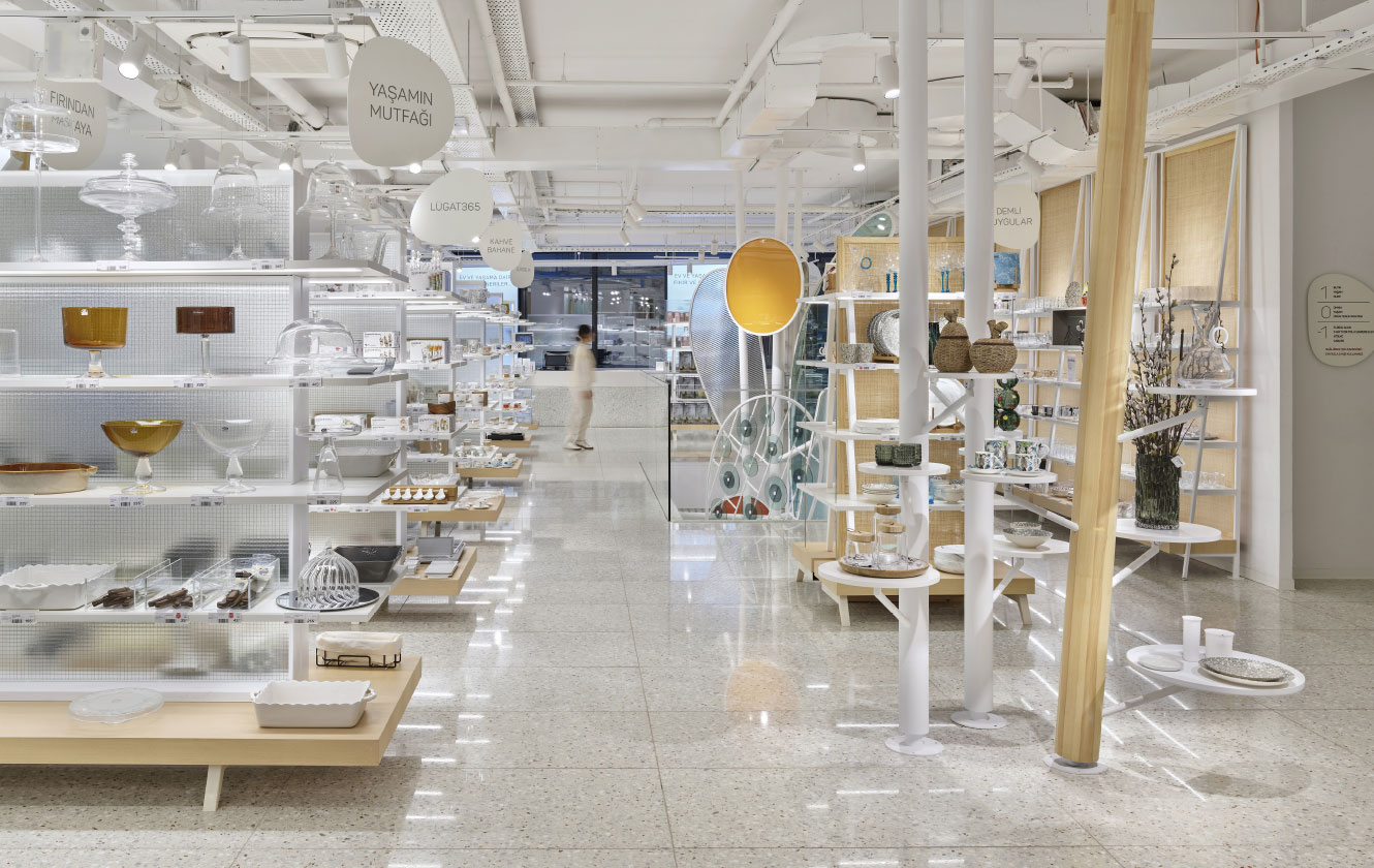 As the product themes diversify, the material language of the exhibition units changes and the product presentations become richer, transforming the store into an innovative stage. Visual and architectural strategy prioritizes focus on products. The design strategy, which offers innovative solutions for retailing through its modular and mobile display units, provides flexibility and economic efficiency to the brand. Backgrounds in which wicker, glass and metal meshes are chosen according to the character of the theme are enriched with inspirational trend areas that make the selection process of customers with different styles more efficient. These specialized areas, where products of different themes are presented together, offer up-to-date style suggestions to the customer, sometimes on a shelf and sometimes as an interior. The first examples of these trend areas describe different styles and abstractions of nature, ranging from the kitchen of a country house, from contemporary interior architecture trends to a tea corner designed with a 'Grand Millennial' style.