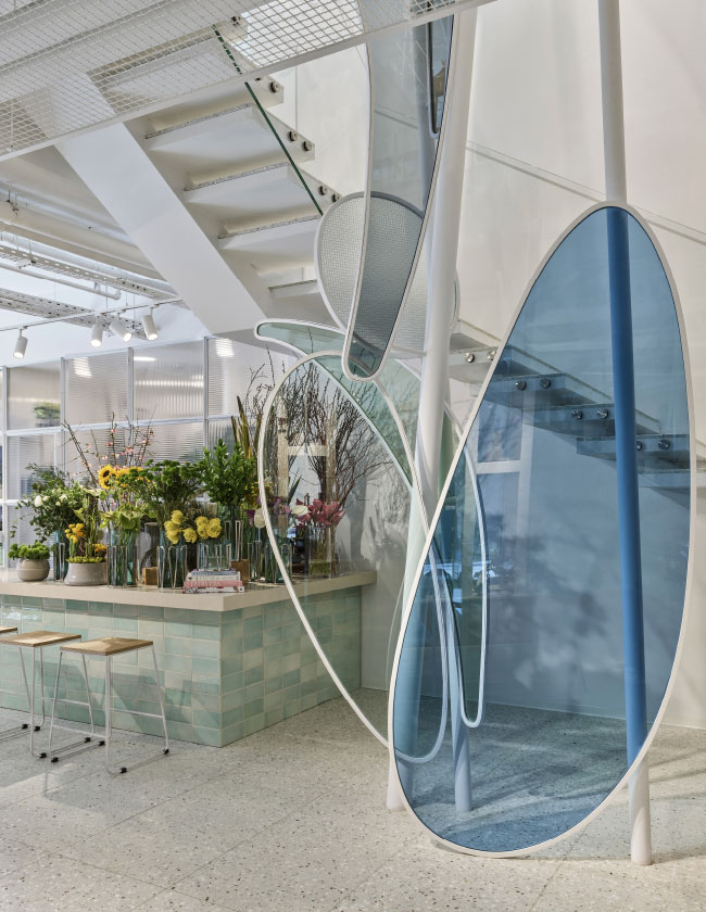 Fresh flowers and live plants are located in the floral area on the bottom floor of the store. This area provides a colorful addition to the space by ensuring that customers have a joyous time. The exhibition areas enriched with the nature of handmade ceramics developed specifically for Paşabahçe Mağazaları bring nature itself to the space, making the experience sincere. Located in this natural atmosphere, the workshop area hosts events and offers the store a dynamic meeting and experience space.