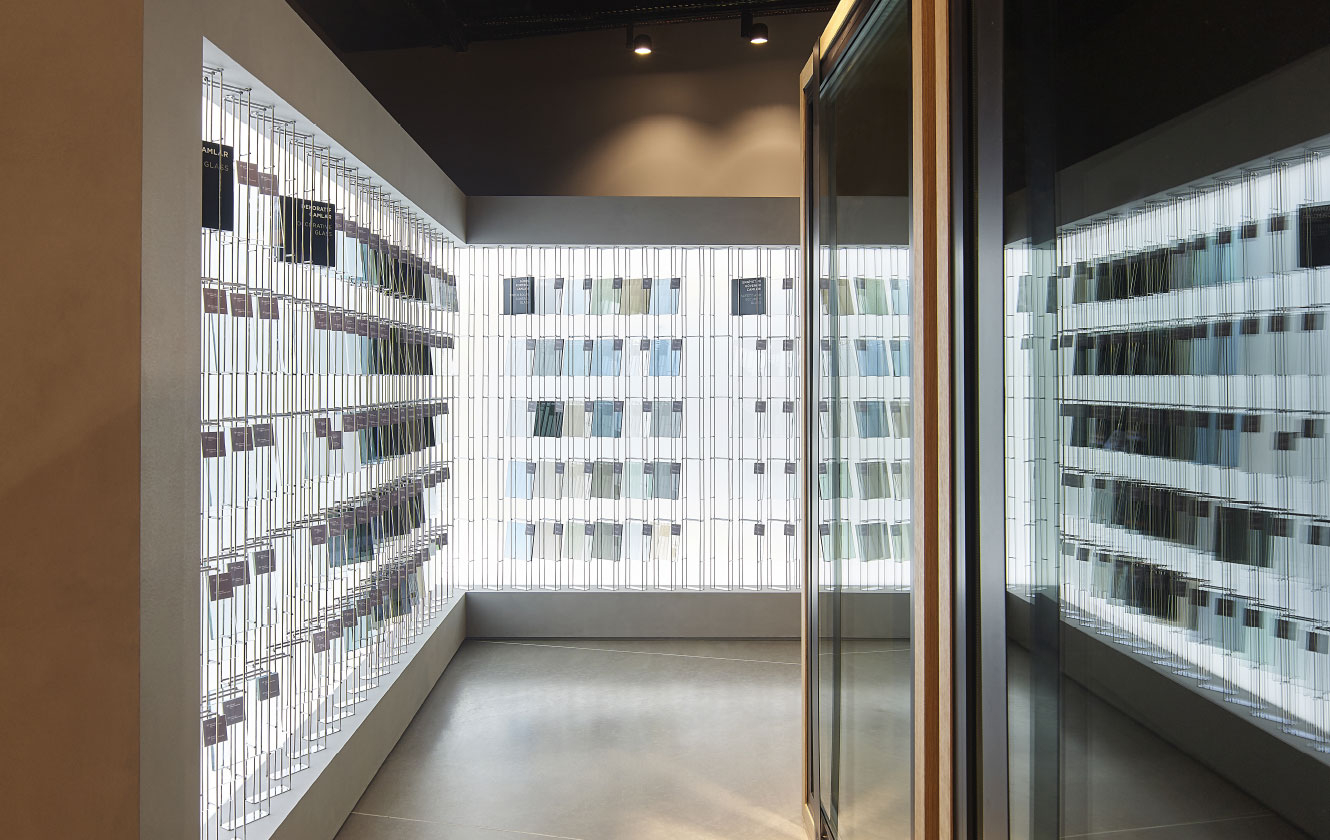 The unit that exhibits 130 different glass types of various characteristics and compositions lets the brand present its wide product range all together. The functional design with the sliding system makes it easy to examine each product separately.