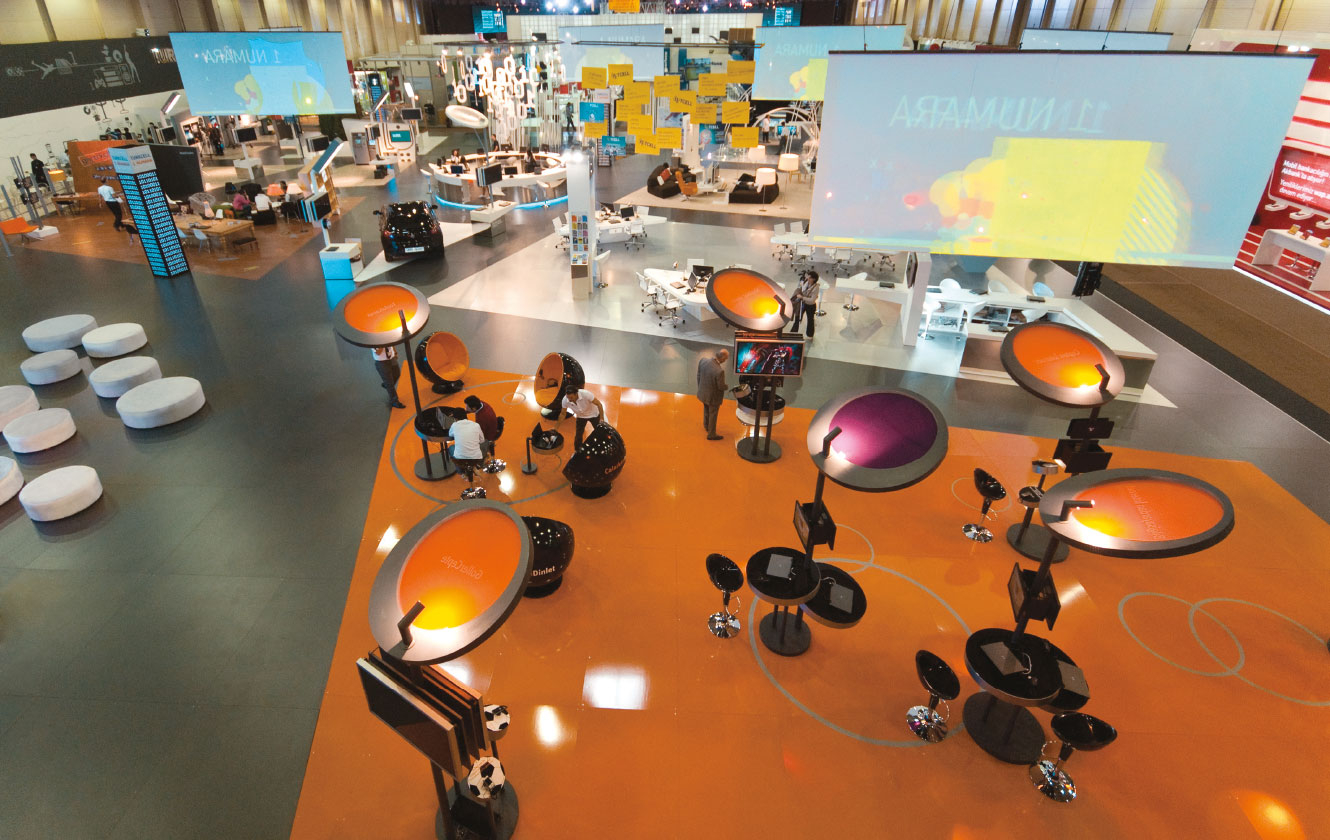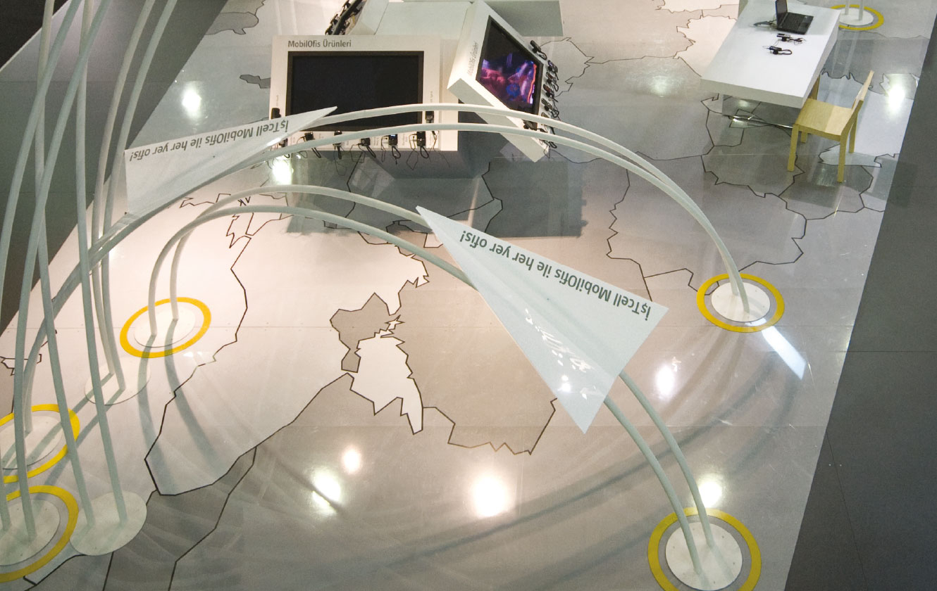 Roaming is represented with the world map graphic on the floor, the bended wireframes and the origami planes expressing the international comminication services. Office section is with the white tables and the giant post- it notes to create a working atmoshere. When they all come together, they make a union. There were big digital presentation screens hanging from