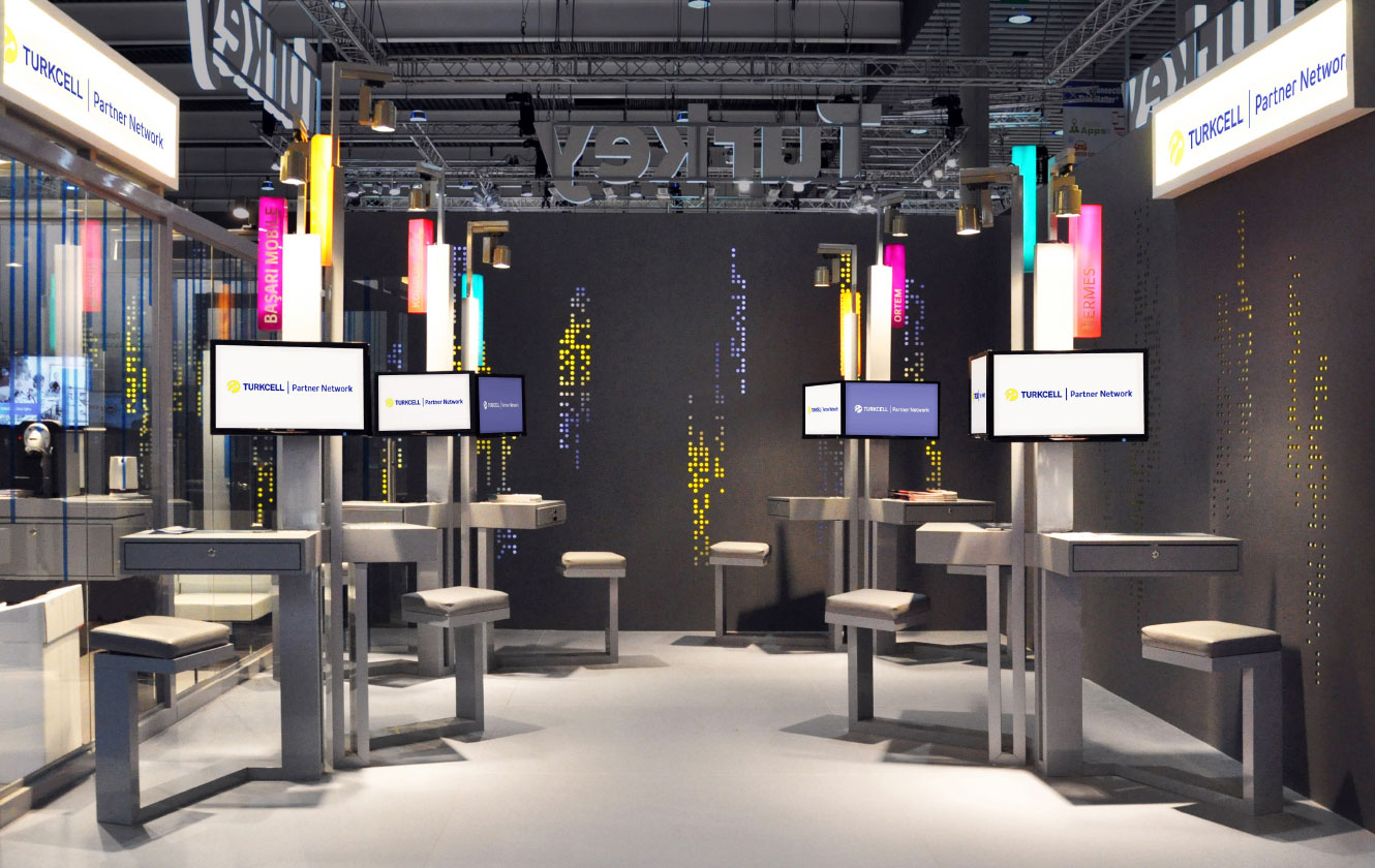 The design and realization of the exhibition stand design, representing Turkcell Teknoloji and Turkcell Partner Network at the GSMA 2015, was carried out by Demirden.