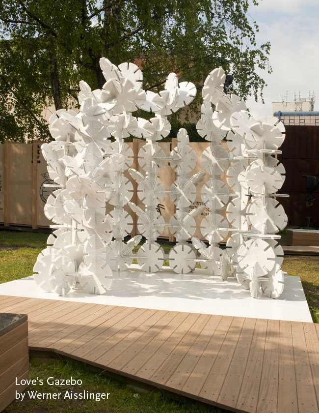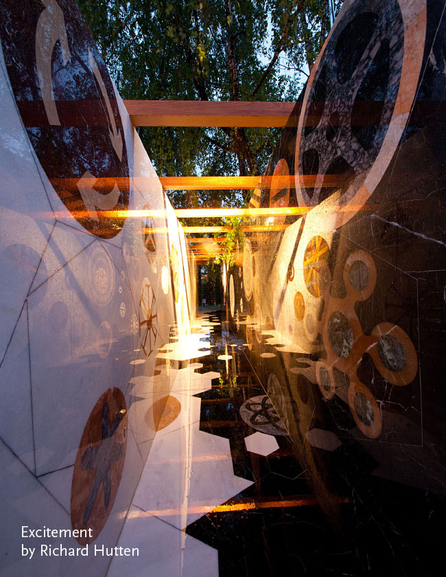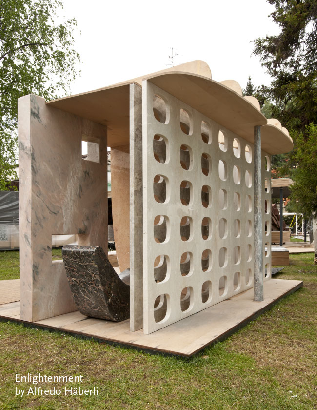Thus Spoke the Marble: The Journey Alters You was built across nine platforms, each carrying an installation, and linked by wooden and iron pathways, representing the metaphor of the inner journey. The projects exhibited including a ‘Marble Rosarium’ by Berlin-based architect and designer Werner Aisslinger, a stunning arrangement of marble slabs crafted into the shape of flowers and combined into a playful secret garden space, whereas the leading Dutch designer Richard Hutten invited visitors on a somewhat uncomfortable walk inside a crate entirely covered with polychromic marble that reproduces worlds and symbols from the realm of imagination. The Anglo-Spanish duo El Ultimo Grito (Rosario Hurtado and Roberto Feo) has created an installation where visitors can sit or lie down on a gently sloping piece of marble, while James Irvine challenges gravity by keeping a heavy tabletop suspended