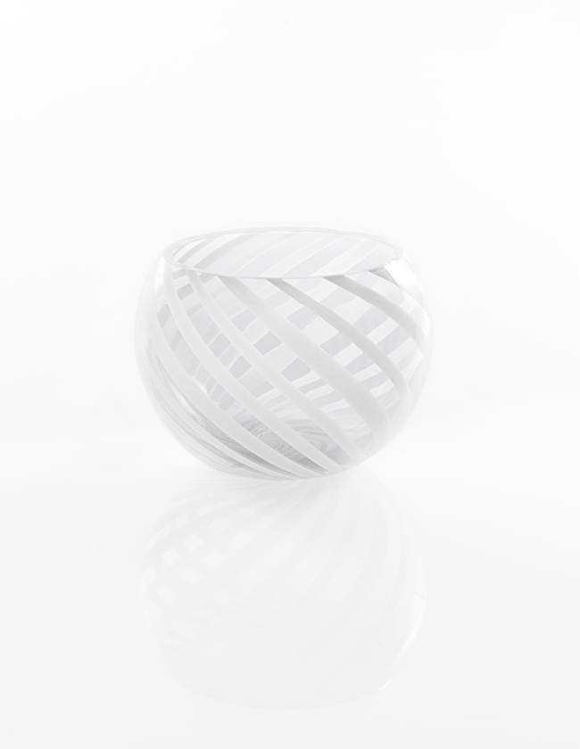 This technique, applies colored tube glasses on to a clear glass; they are melted and blown together. The play with the thickness, density and movement of the white glass tubes brings the variety of lines within each size of vase.