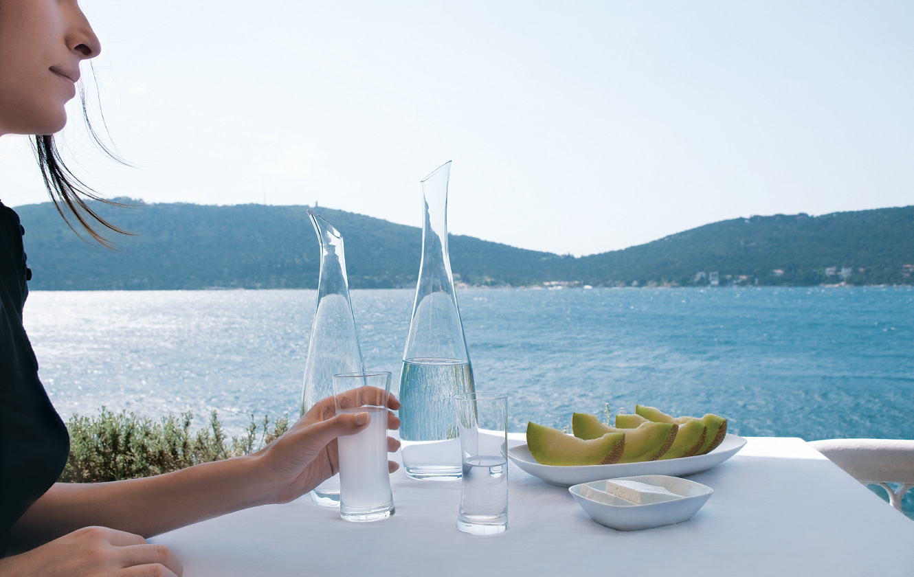 neyzen epitomizes the intoxicating charms of anis-flavoured rakı that will turn a milky white when touched by water. The carafe and glasses complement each other in tipsy harmony.