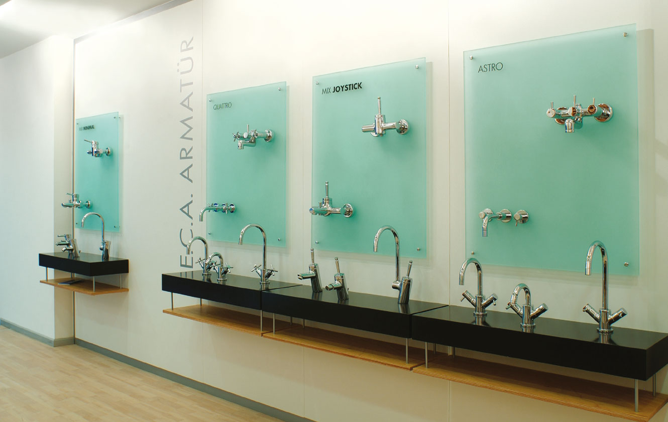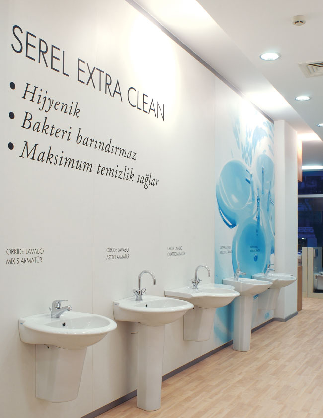 Mağazaların tasarım çizgisini, üstün teknoloji temsilcisi, güçlü bir marka olgusunun; tasarlanmış, hijenik ürünler ve su teması üzerine geliştirdik. Minimalist ve prestijli...