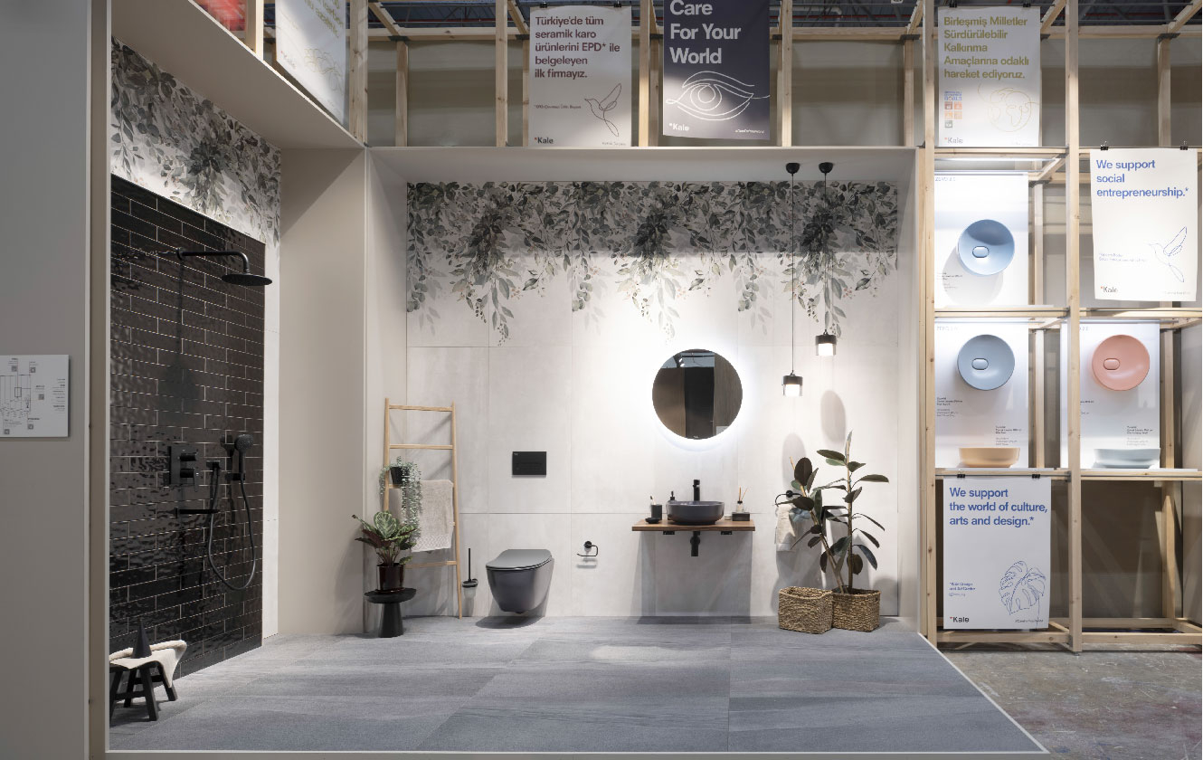 Sergileme alanını baştan sona kavrayan ve “İyi Bak Dünyana” adı verilen uzun duvar boyunca Kale’nin çevreci ürünleri, sanat ve tasarım ile ilişkisi ve sosyal fayda projeleri sergileniyor. Sergileme alanının merkezinde ise yeni ürünlerin bir doğa stilizasyonuyla soyut sergilendiği alanlar yer alıyor. Yeniden kullanım amacıyla tasarlanan “İyi Bak Dünyana” duvar konstrüksiyonu esnek ve modüler bir yapı imkanı sunarak sürdürülebilir mekan tasarım stratejisine katkı sağlıyor.
