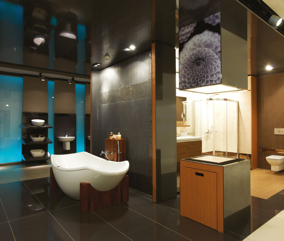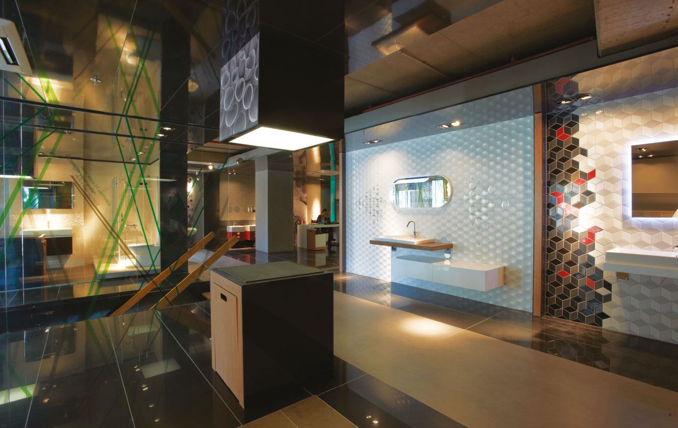 Diğer ana sirkülasyon aksı ise teknik koridora paralel bir şekilde ilerler... Ziyaretçiler bu iki aks arasında geçiş yapabilmekte ve ortalarında yer alan ürün sergileme birimlerini rahatlıkla gezebilmektedir. Binanın çekirdeğini saran, mavi renk ile aydınlatılan cam duvar, mağaza içerisinde su soyutlaması için kullanılır. Bu bölümde vitrifiye ve hemen yakınında armatür ürünleri sergilenir. Bu ürünlerin sergilemesi hem ürün gruplamaları yapmaya uygun, hem de ürün değişimlerinin kolayca yapılabilmesi mantığı üzerine kurgulanmıştır.