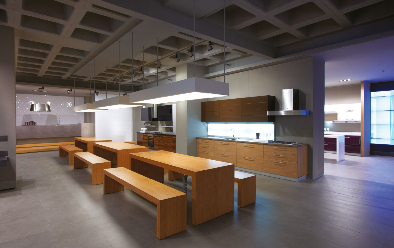 Mağaza görsel stratejisinin temel unsurlarından olan BetonArt sıva yüzeyli duvarlar, hem çağdaş mimari vurgusu yapmakta hem de mutfak bölümün yapısal temelini oluşturmaktadır.