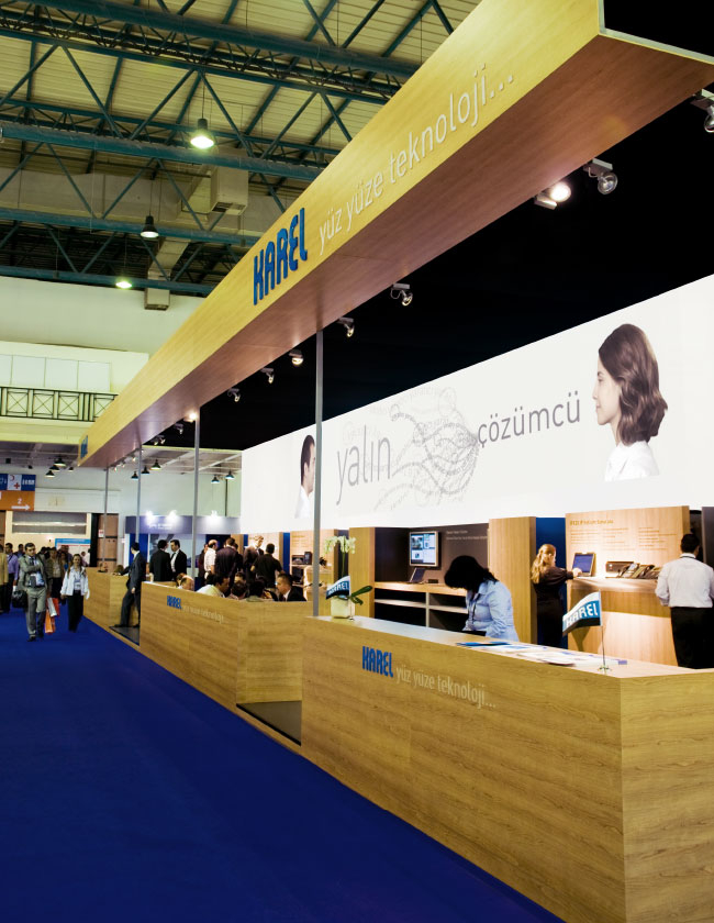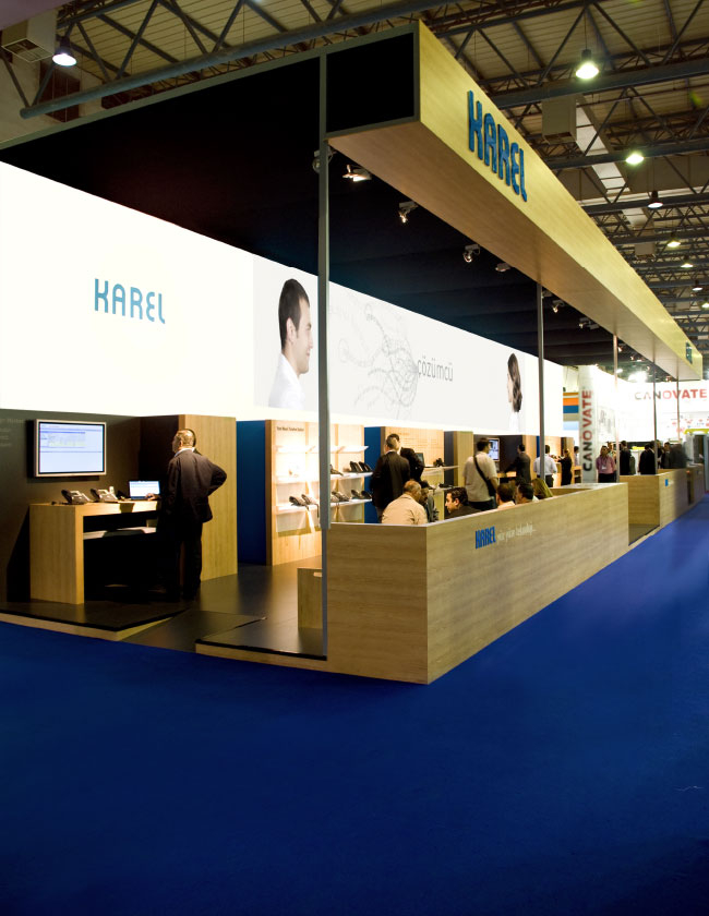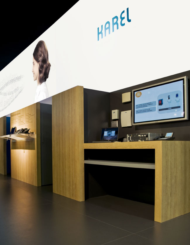 Ekranın altındaki raflar boyunca Karel operatörleri ve telefonları sergilendi. Materyaller ve renkler açık, teknik ama yine de sıcak bir his vermek için seçildi.