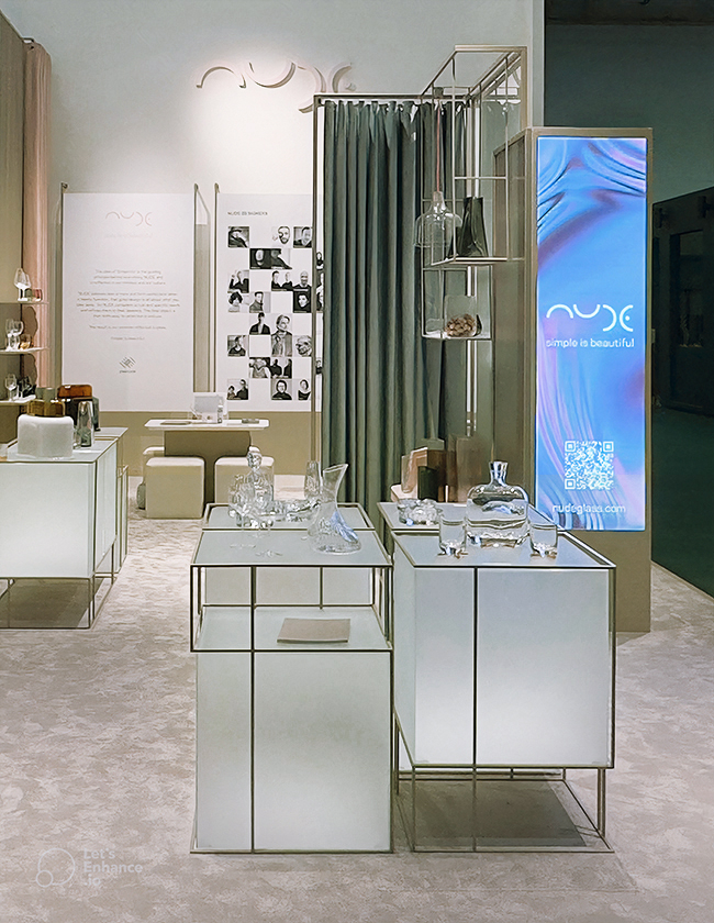 Sergileme sahnesinin oluşturduğu ambiyans, saf güzelliğin ve sadeliğin benzersiz Nude detaylarıyla zenginleştirildiği; duyuları ve hayalleri harekete geçiren modern bir tasarım stratejisiyle kurgulandı. Camın büyülü zerafeti, metalin yalın mimarisi ve kadifenin şık dokusu ile rafine malzemeler bütünsel bir denge ve uyum içinde bir araya getirildi.