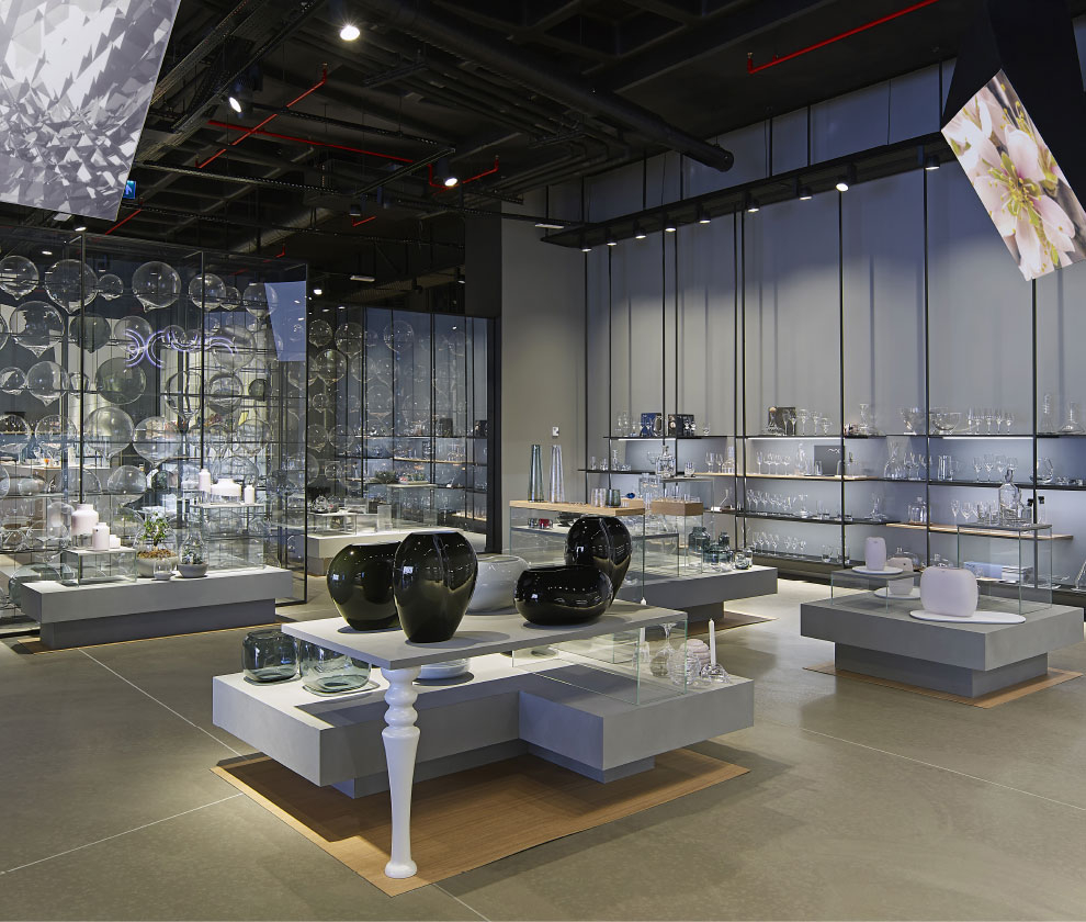 Nude showroom, yalın ve şık tasarımı ile ziyaretçileri sofistike dünyasına çağırıyor. Paravan fonksiyonu üstlenen, farklı ebatlardaki el yapımı cam kürelerden oluşan etkileyici enstalasyon Nude’un yalın dünyasına açılan ilham veren