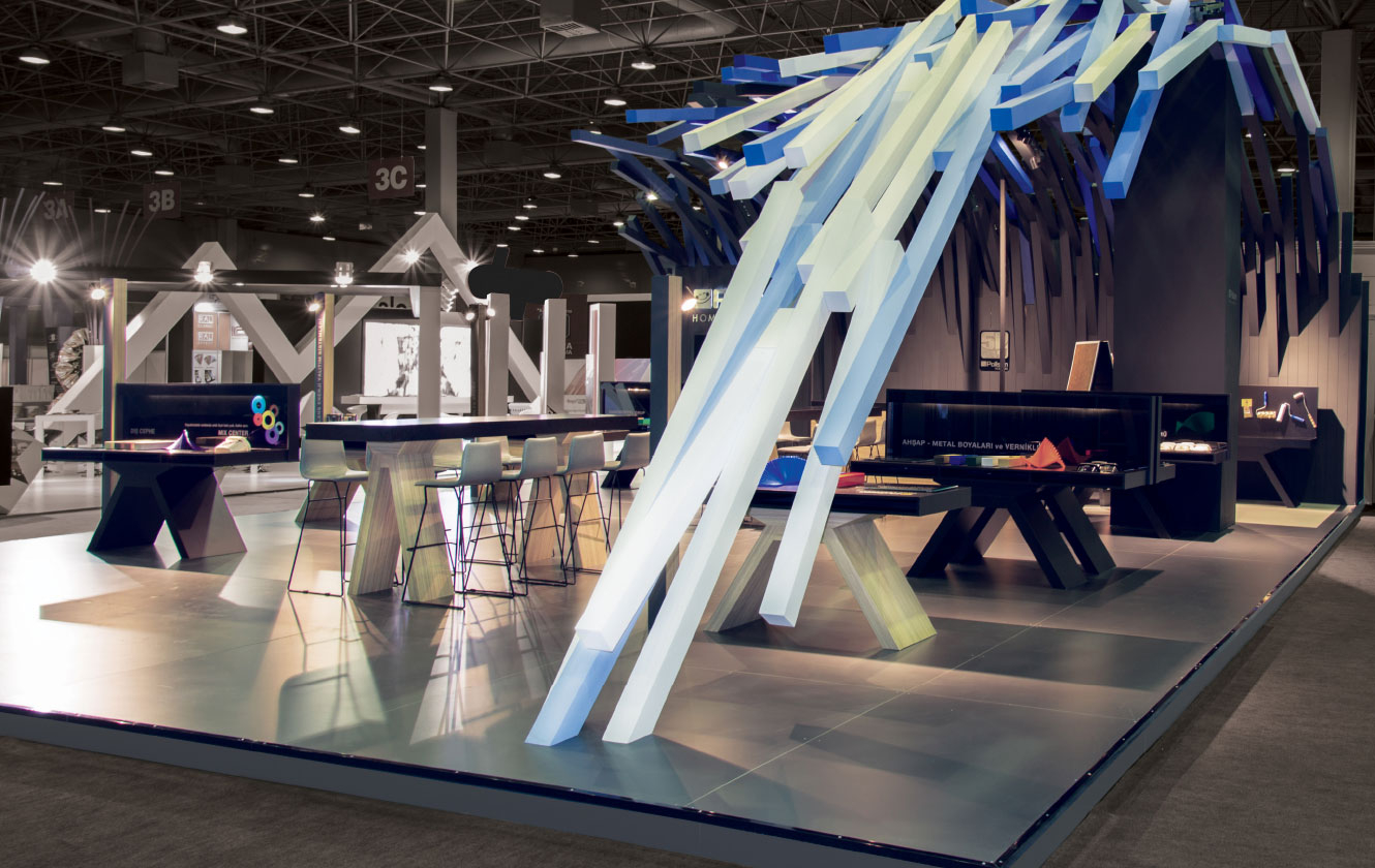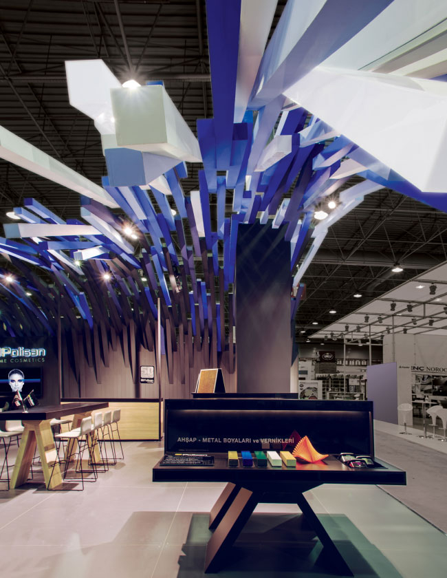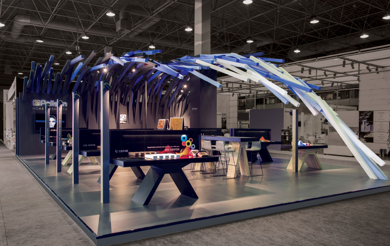 Bir çok prizmanın bir araya gelmesi ile oluşan örtü, markanın ilham veren değerinin yanı sıra zorlu ve yoğun işçiliği ile titiz, profesyonel ve uzman bir marka oluşuna vurgu yapmaktadır… Ziyaretçilere farklı bir deneyim yaşatan Polisan standı üç ana koldan sınırları kaldırılmış davetkar yapısıyla samimi bir iletişim yolunu önermekte.