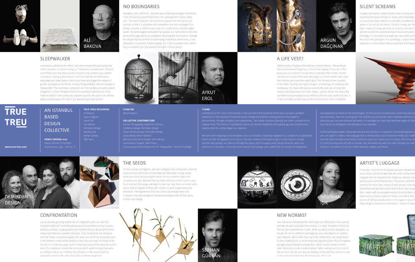 13 Mayıs-26 Kasım 2017 tarihleri arasında düzenlenen Venedik Bienali 57. Sanat Bienali’nin paralelinde GAA Vakfı tarafından organize edilen Venice Design 2017 Ali Bakova, Argun Dağçınar, Aykut Erol, Can Yalman, Demirden/ilio, İzlem Akman, Neslihan Işık, Serhan Gürkan ve Yiğit Yazıcı’dan oluşan True Treu tasarım kolektifine de ev sahipliği yaptı.