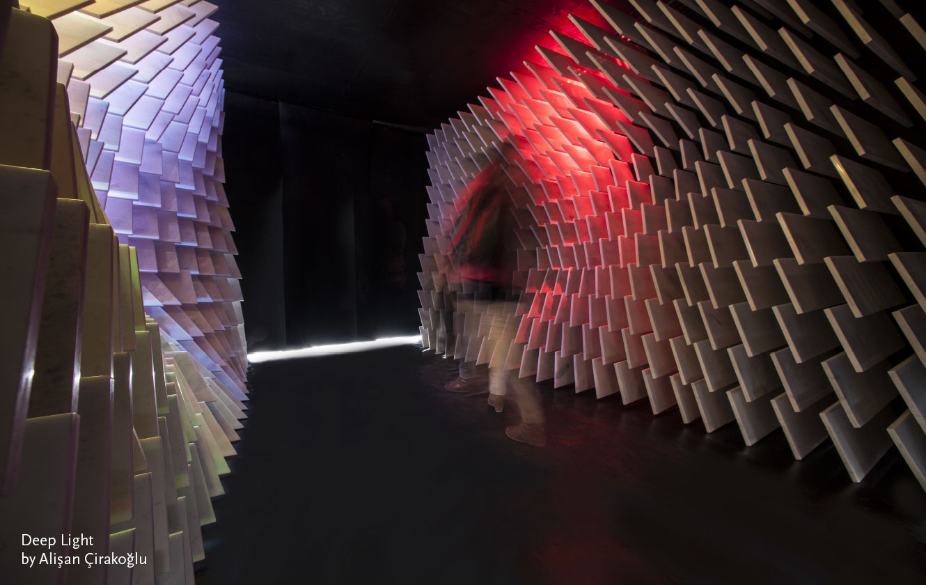 “Işıkla Yıkanmak” sergisinde, mermer, su ve ışığa odaklanarak, temizlik, saflık ve arınma gibi kavramları ifade etmek için ideal bir kombinasyon ortaya çıkartıldı. Mermer, bu birliktelik içerisinde kendini pürüzsüz, parlak, ideal yüzeyiyle konumlandırırken, bu elementler tarafından dokunulduğu zaman tüm ihtişamı ve güzelliğiyle de var etti.