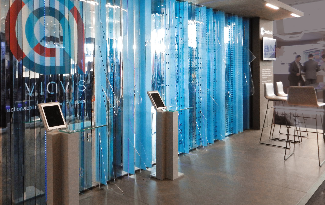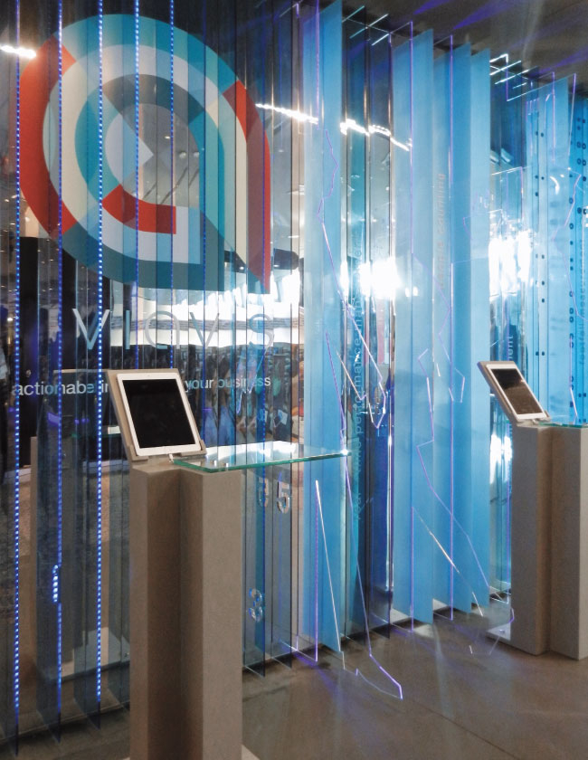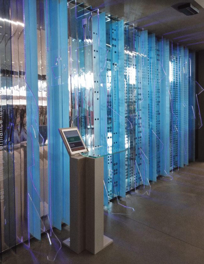 Mekanın çizgiselliği ve fona yerleştirilen ögeler teknolojik çağrışımlar yaparken, tasarım perakende sektörünü ve alışveriş dünyasını üçüncü boyuta grafiksel bir anlatımla taşımaya odaklanıyor. Kişi sayma özelliğini anlatan rakamlar ise, fondan boyut kazanıp uzaklaşarak mekan içine entegre oluyor. Işık oyunlarıyla zenginleştirilen fon, üzerindeki silüetlerin alan içerisinde ziyaretçilerle buluşmalarını sağlıyor.